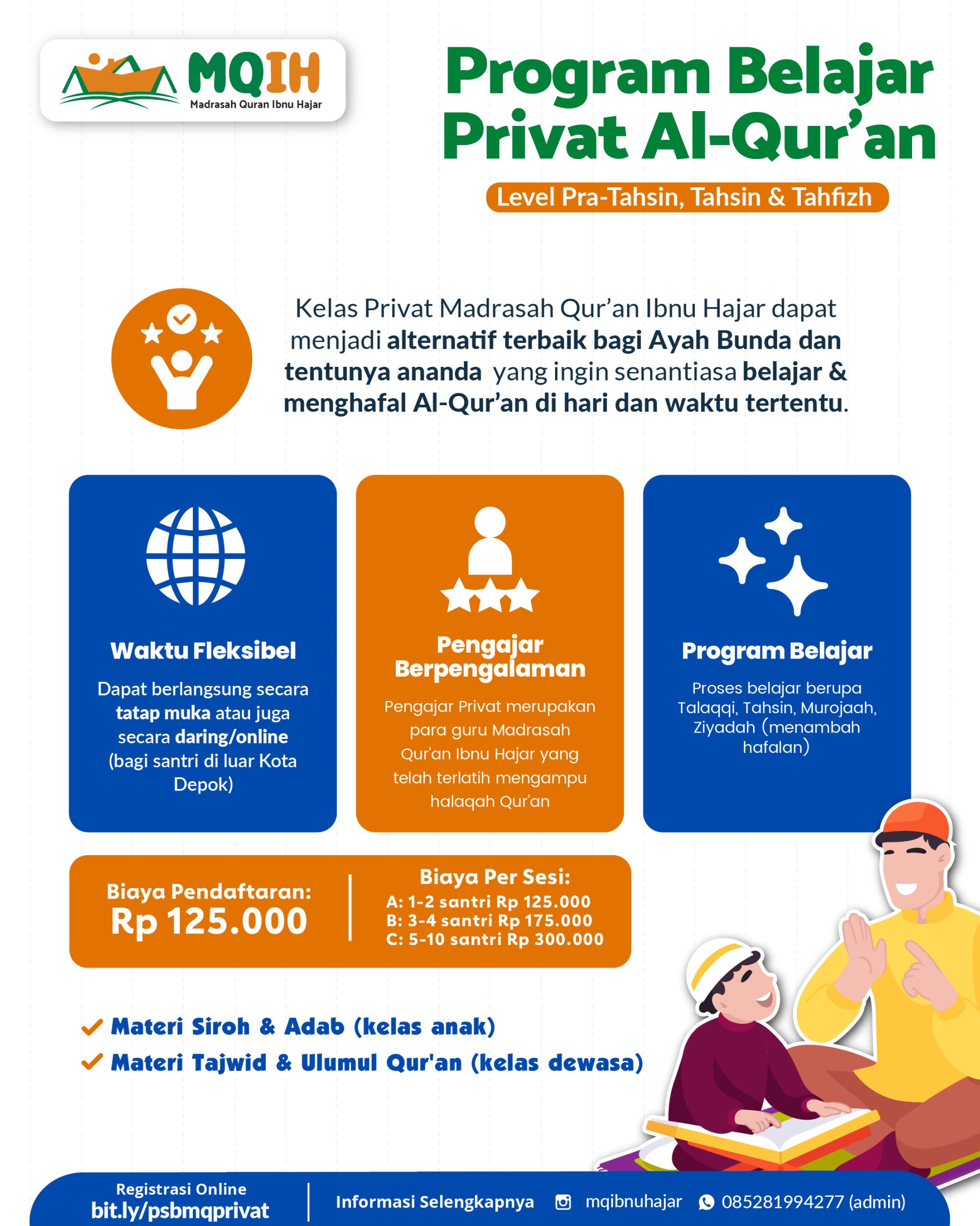 Kelas Privat Madrasah Qur’an Ibnu Hajar menjadi alternatif terbaik bagi Ayah Bunda dan tentunya ananda yang ingin senantiasa belajar & menghafal Al-Qur’an di hari dan waktu tertentu.